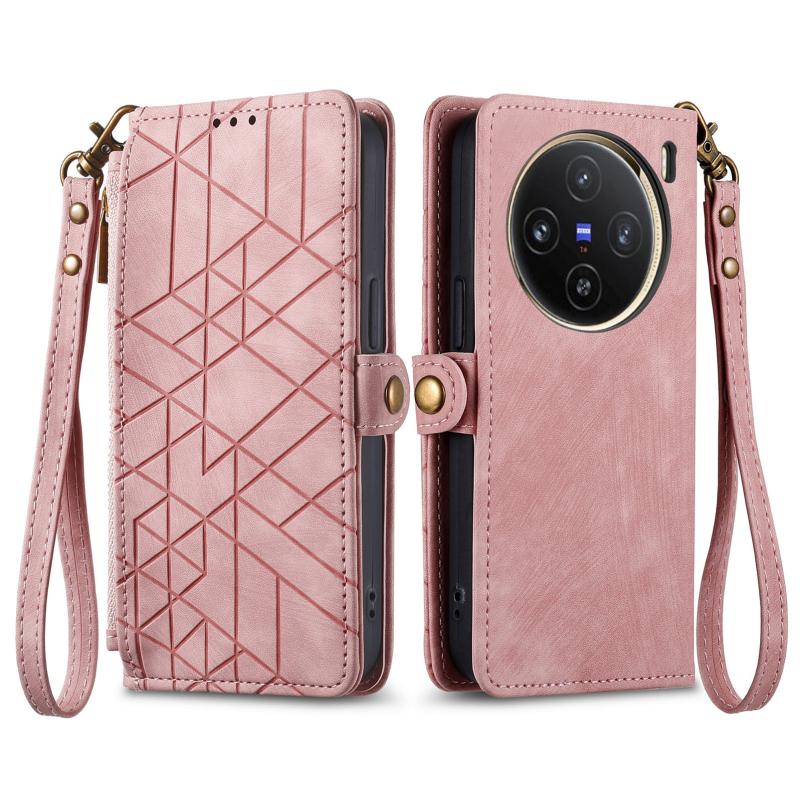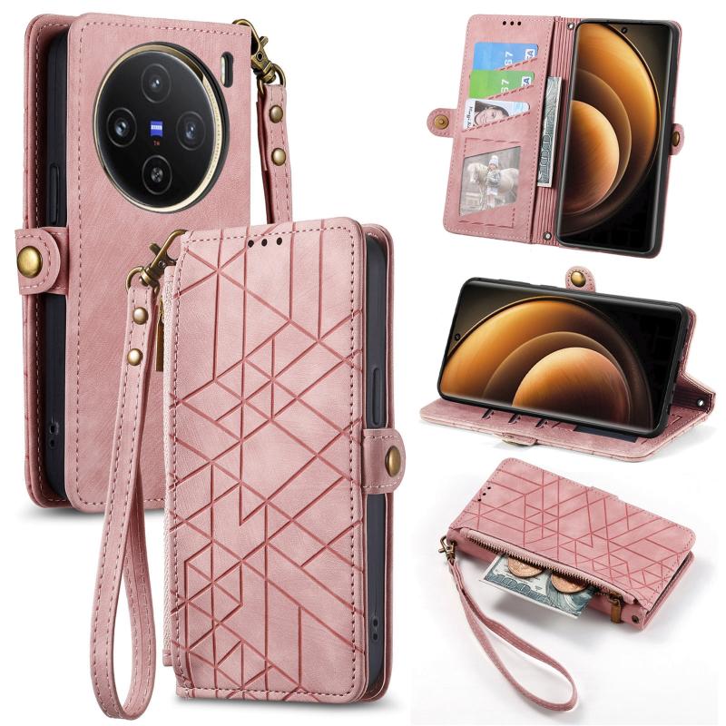 For vivo X100 Geometric Zipper Wallet Side Buckle Leather Phone Case(Pink)