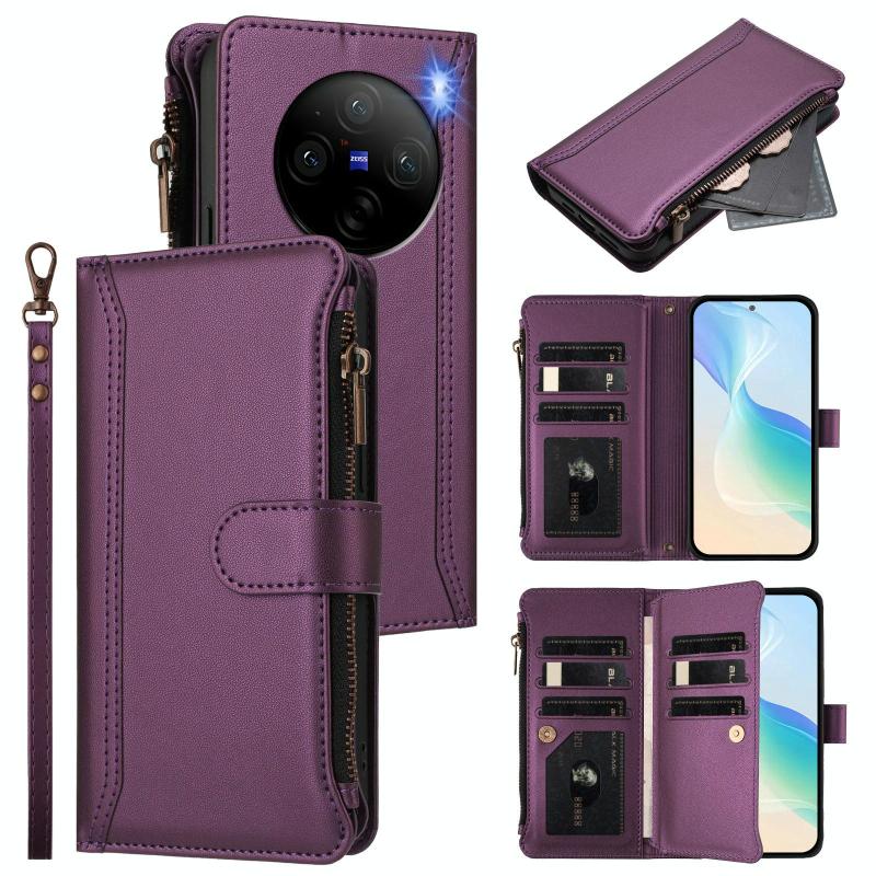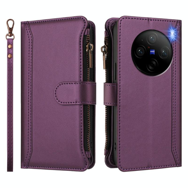 For vivo X100 Pro 5G / X100S Pro 5G Magnetic Closure 9 Card Slots Zipper Leather Case with Hand Strap(Purple)