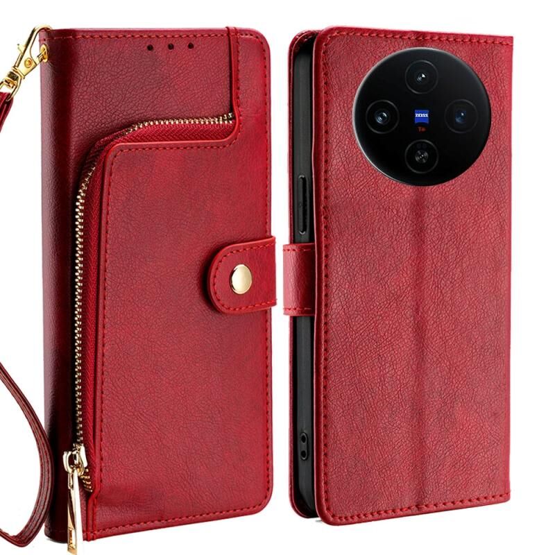 Για vivo X100s φερμουάρ τσάντα δερμάτινη θήκη τηλεφώνου (κόκκινο)