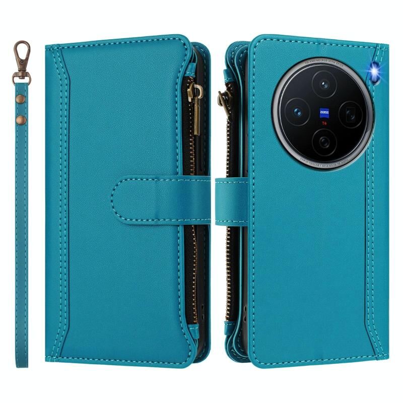 Για vivo X200 5G Μαγνητικό Κλείσιμο 9 Θήκες Καρτών Δερμάτινη Θήκη με Φερμουάρ και Λουρί Χεριού (Τουρκουάζ)