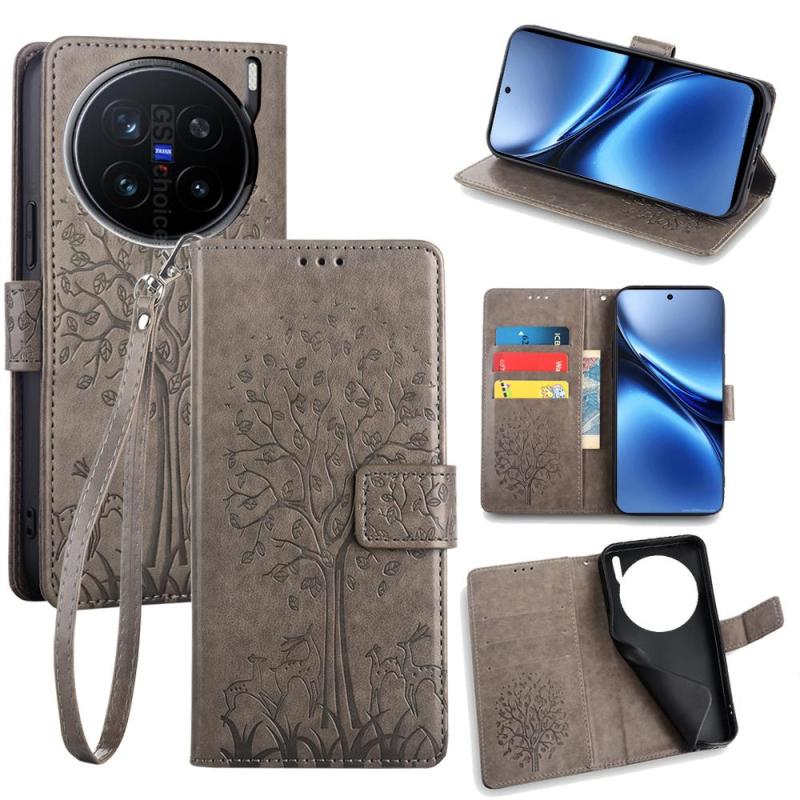 For vivo X200 Pro 5G Tree & Deer Embossed Leather Phone Case(Grey)