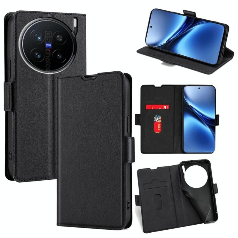 Θήκη τηλεφώνου δέρμα οριζόντιας αναδίπλωσης για vivo X200 Pro 5G, εξαιρετικά λεπτή με πλευρική αγκράφα τάσης (Μαύρο)