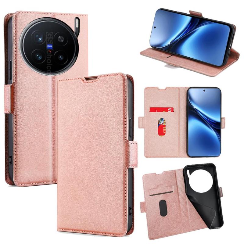 Θήκη τηλεφώνου δέρμα οριζόντιας αναδίπλωσης για vivo X200 Pro 5G, εξαιρετικά λεπτή με πλευρική αγκράφα τάσης (Ροζ χρυσός)