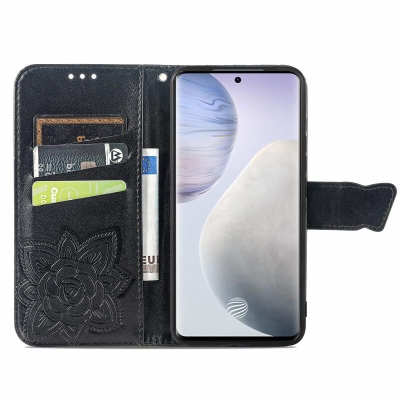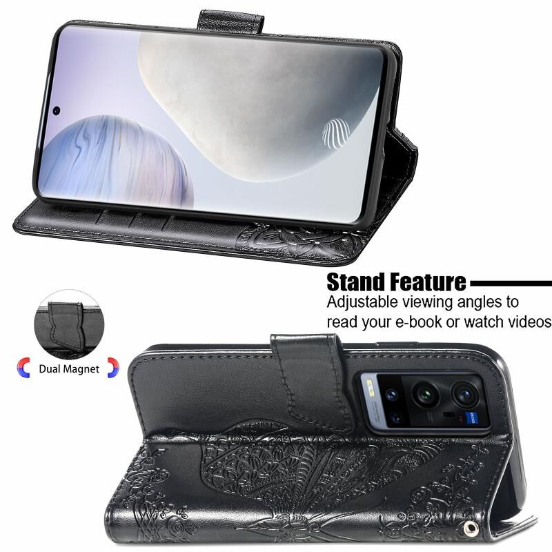 Για το vivo X60 Pro + πεταλούδα αγάπη λουλούδια ανάγλυφο οριζόντια Flip δερμάτινη θήκη με κάτοχο & υποδοχές για κάρτες & πορτοφόλι & κορδόνι (Μαύρο)