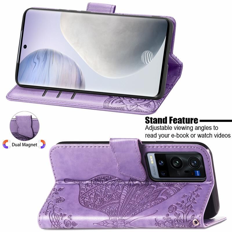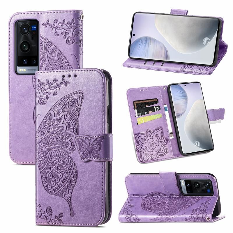 Για το vivo X60 Pro + πεταλούδα αγάπη λουλούδια ανάγλυφο οριζόντια Flip δερμάτινη θήκη με κάτοχο & υποδοχές για κάρτες & πορτοφόλι & κορδόνι (ανοιχτό μωβ)