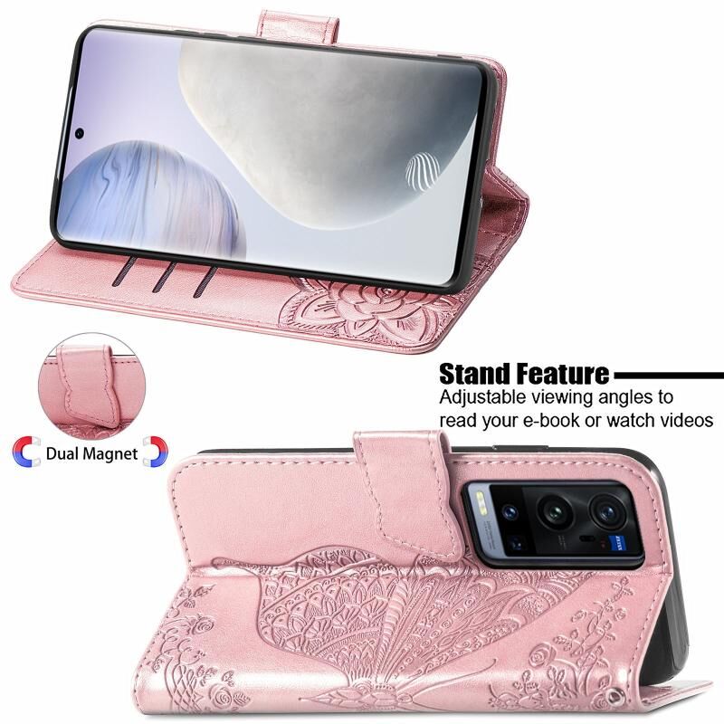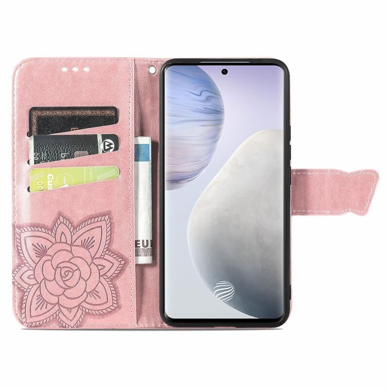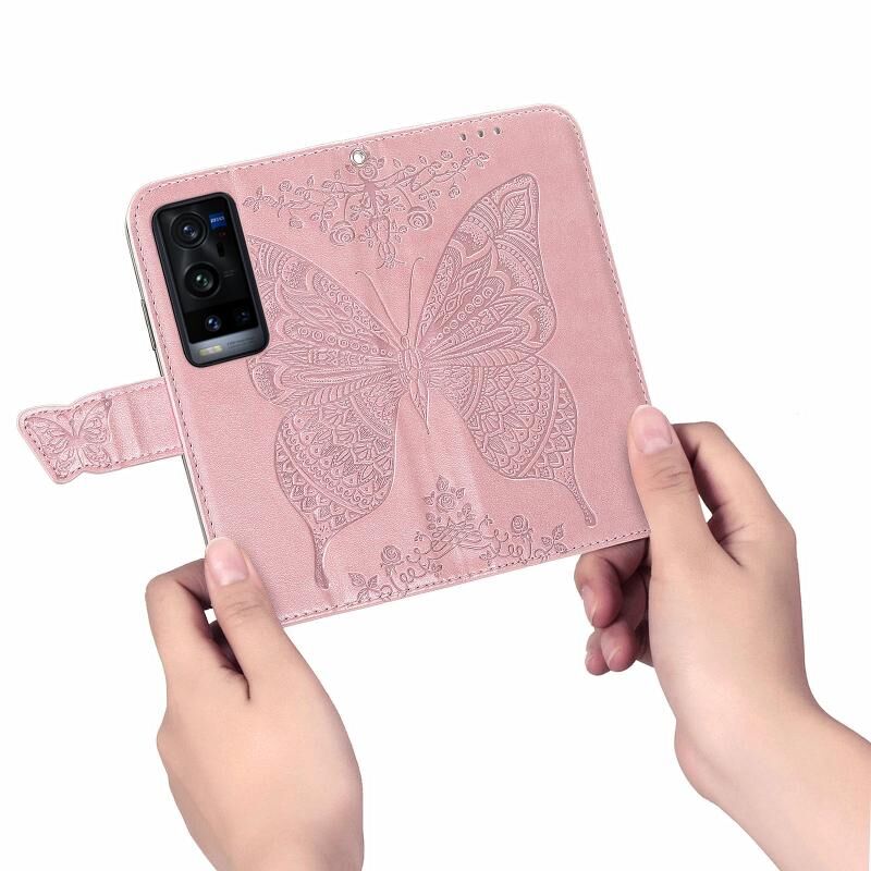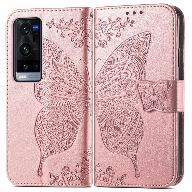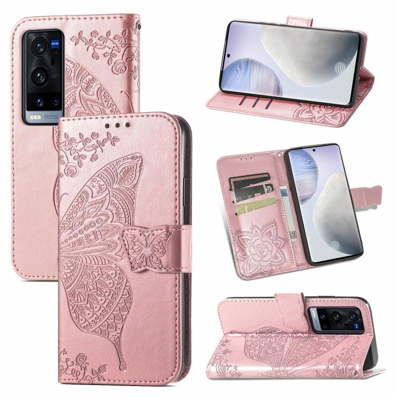 Για το vivo X60 Pro + πεταλούδα αγάπη λουλούδια ανάγλυφο οριζόντια Flip δερμάτινη θήκη με κάτοχο & υποδοχές για κάρτες & πορτοφόλι & κορδόνι (Ροζ Χρυσό)