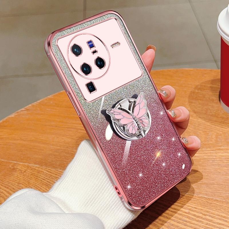For vivo X80 Pro Plated Gradient Glitter Butterfly Holder TPU Phone Case(Pink)