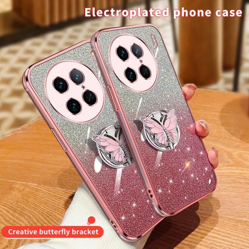 For vivo X90 Pro Plated Gradient Glitter Butterfly Holder TPU Phone Case(Pink)