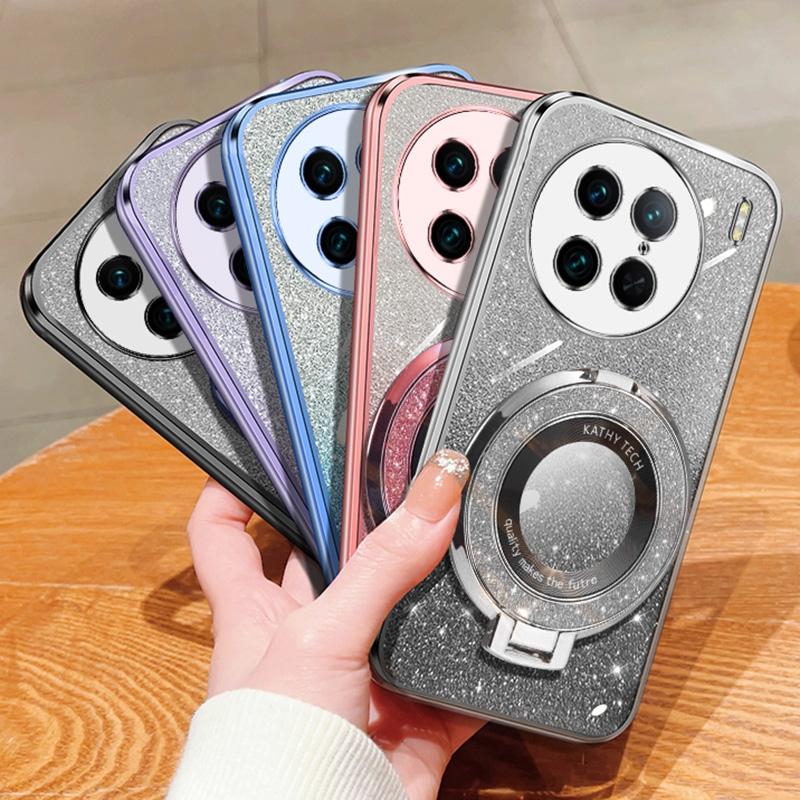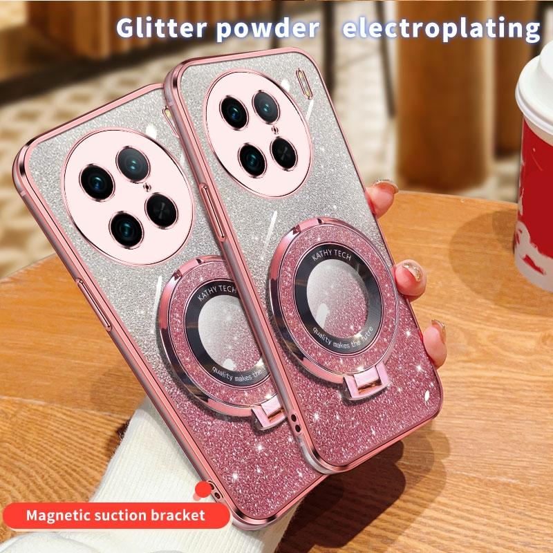 For vivo X90 Pro Plated Gradient Glitter Round Holder TPU Phone Case(Black)