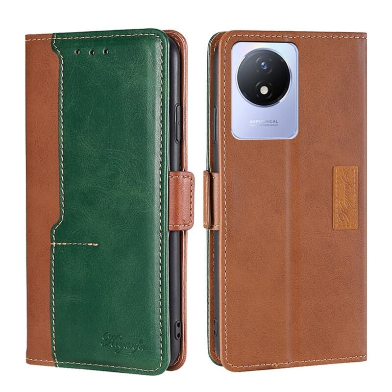 Για το vivo Y02 4G αντίθεση χρώμα πλευρά πόρπη δερμάτινη θήκη τηλέφωνο (ανοιχτό καφέ + πράσινο)
