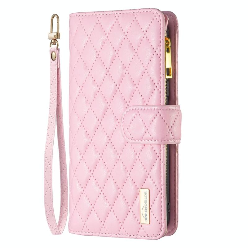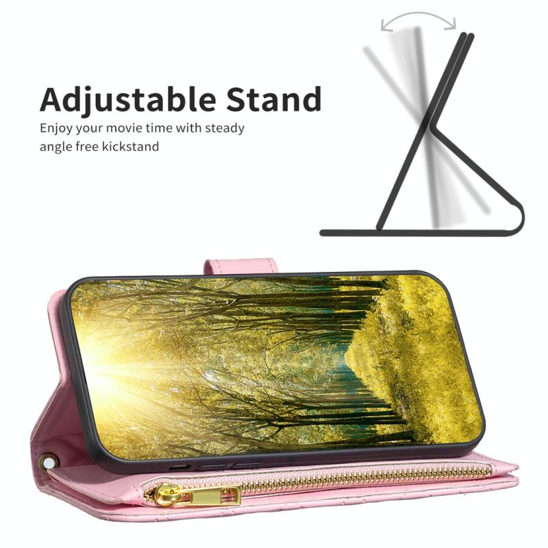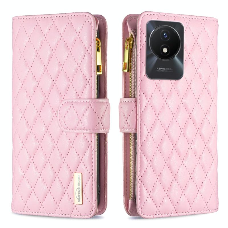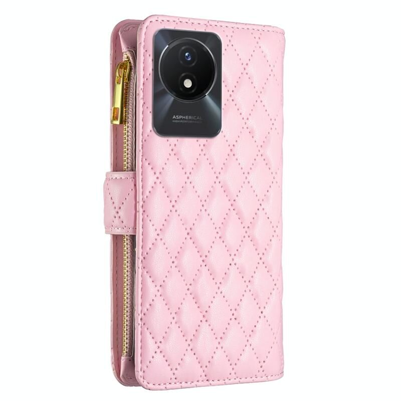 Θήκη τηλεφώνου τύπου πορτοφολιού με φερμουάρ και δερμάτινη κατασκευή για vivo Y02 4G, με σχέδιο διαμαντένιου πλέγματος (ρόζ)