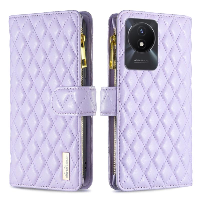 Θήκη τηλεφώνου τύπου πορτοφολιού με φερμουάρ και δερμάτινη κατασκευή για vivo Y02 4G, με σχέδιο διαμαντένιου πλέγματος (Μωβ)