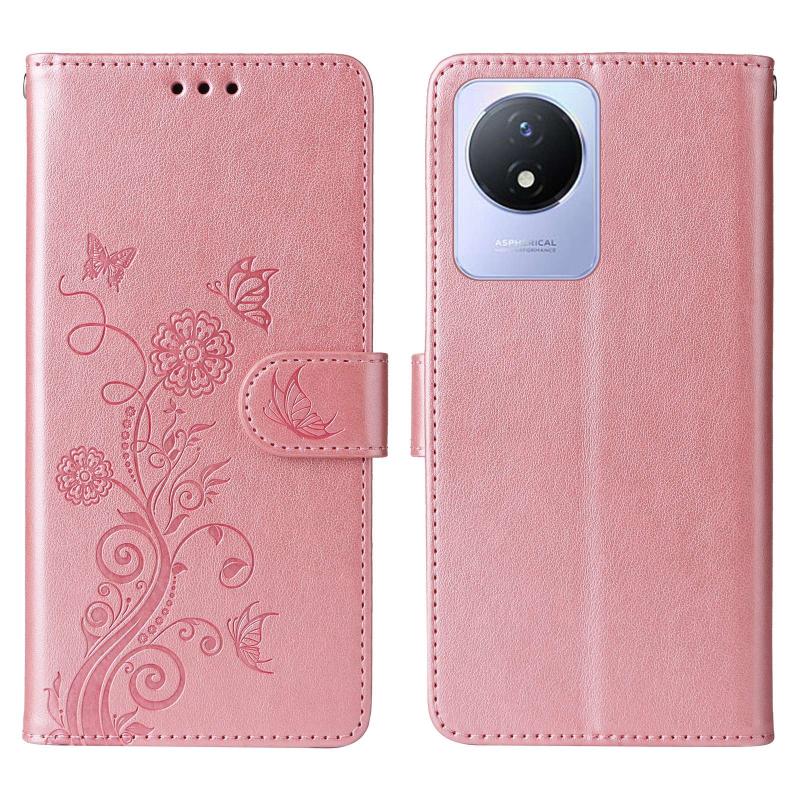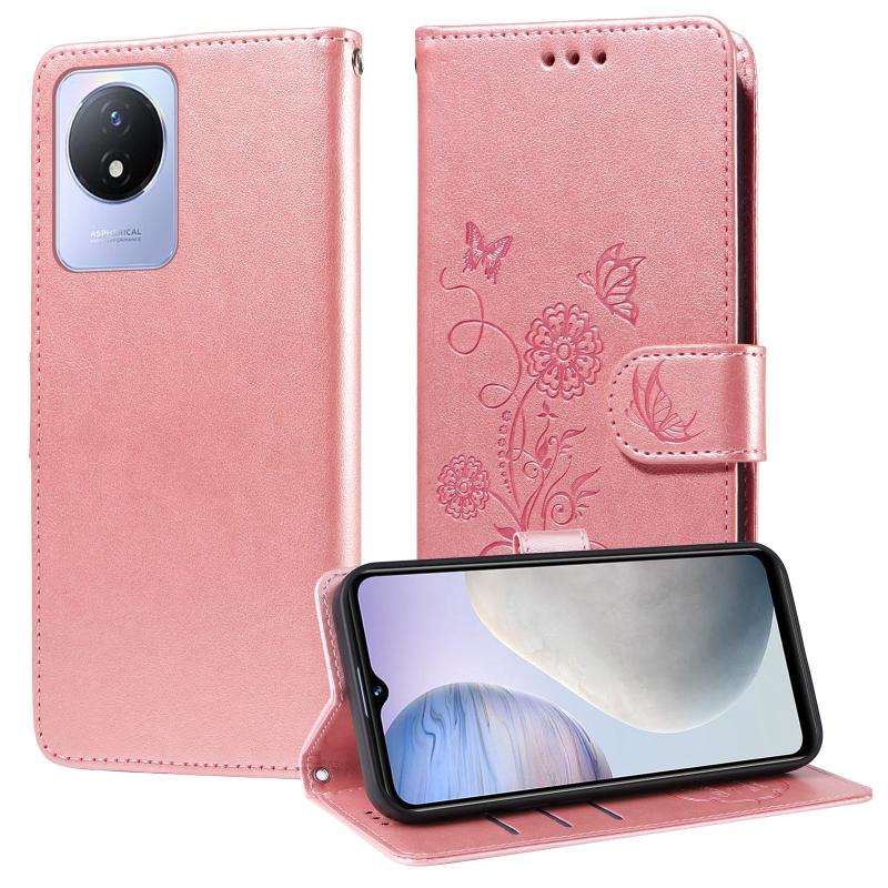 For vivo Y02 4G / Y11 2023 / Y02A Embossed Butterfly Flowers Leather Phone Case(Rose Gold)