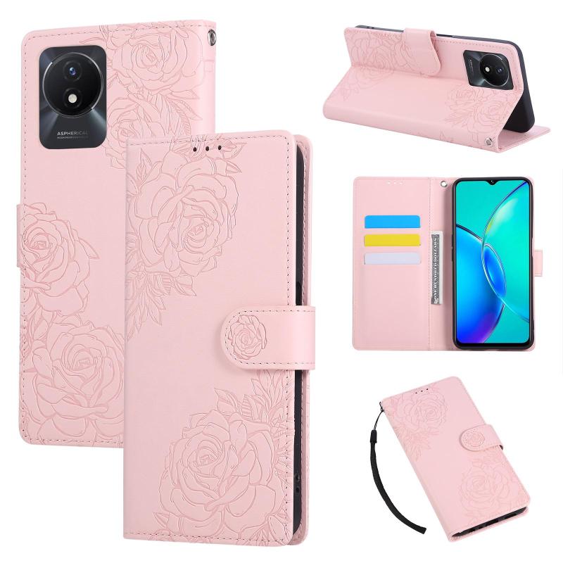 For vivo Y02 / Y11 2023 / Y02A Rose Flower Embossed 3-Card Slots Leather Phone Case(Pink)