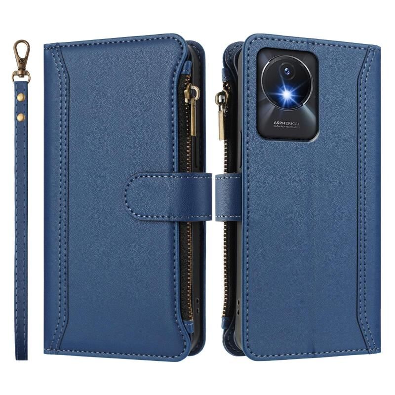Για vivo Y02A 4G / Y02 4G / Y11 2023 / Y02T Μαγνητικό Κλείσιμο 9 Θήκες Καρτών Δερμάτινη Θήκη με Φερμουάρ και Λουρί Χεριού (Σκούρο μπλε)