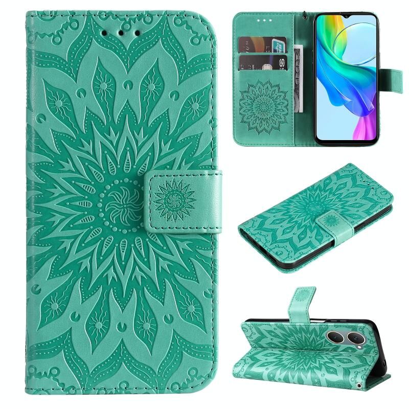 Για vivo Y03 4G ανάγλυφο ηλιοτρόπιο μοτίβο Flip υπόθεση τηλεφώνου δέρμα (πράσινο)