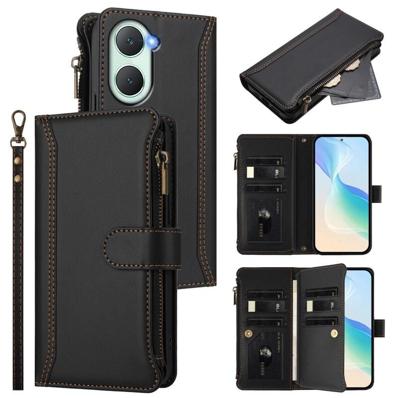 Για vivo Y03 4G Global / Y18 4G Global Μαγνητικό Κλείσιμο 9 Θήκες Καρτών Δερμάτινη Θήκη με Φερμουάρ και Λουρί Χεριού (Μαύρο)