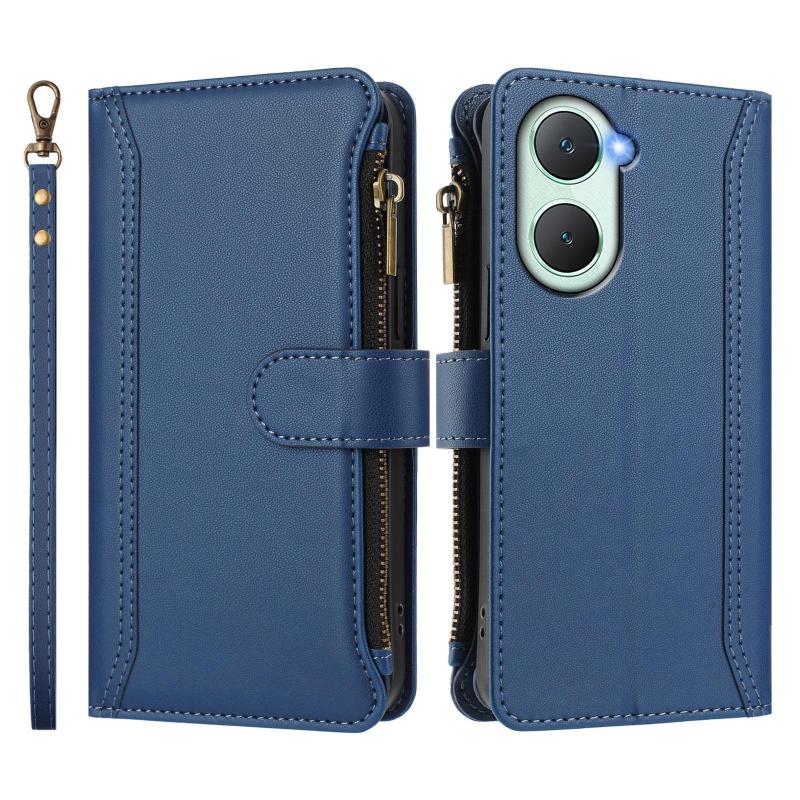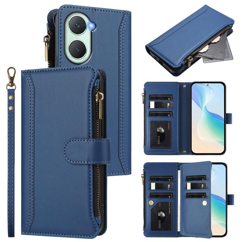 For vivo Y03 4G Global / Y18 4G Global Magnetic Closure 9 Card Slots Zipper Leather Case with Hand Strap(Dark Blue)
