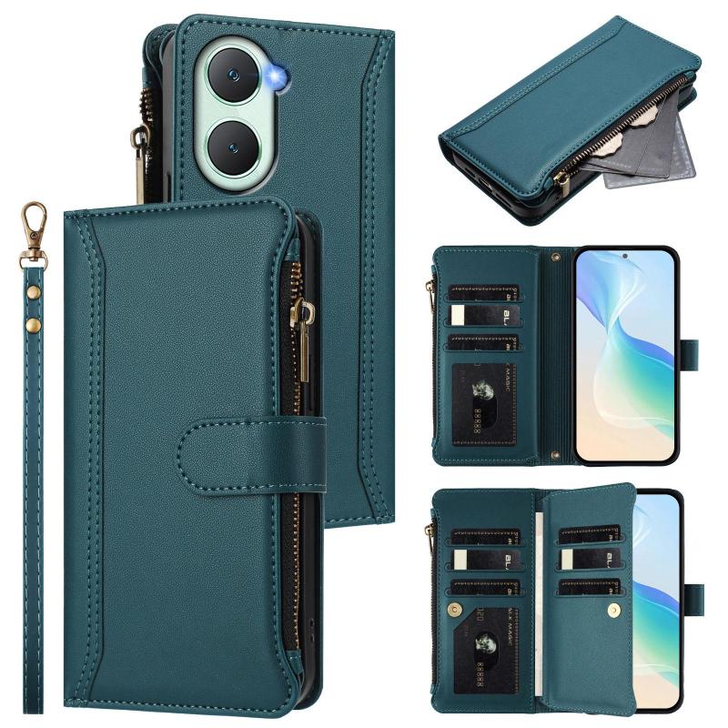 For vivo Y03 4G Global / Y18 4G Global Magnetic Closure 9 Card Slots Zipper Leather Case with Hand Strap(Dark Green)