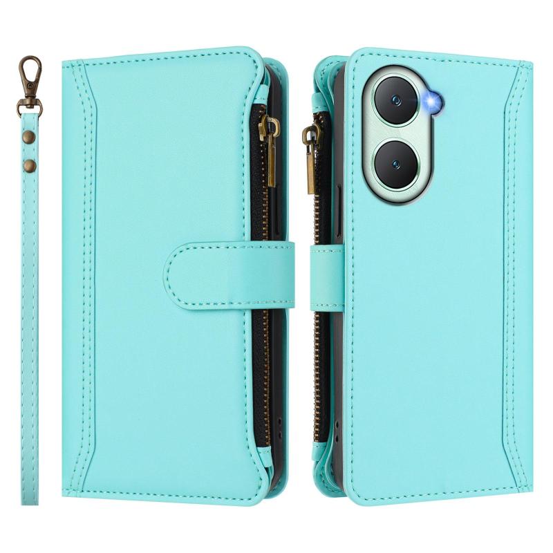 For vivo Y03 4G Global / Y18 4G Global Magnetic Closure 9 Card Slots Zipper Leather Case with Hand Strap(Mint Green)