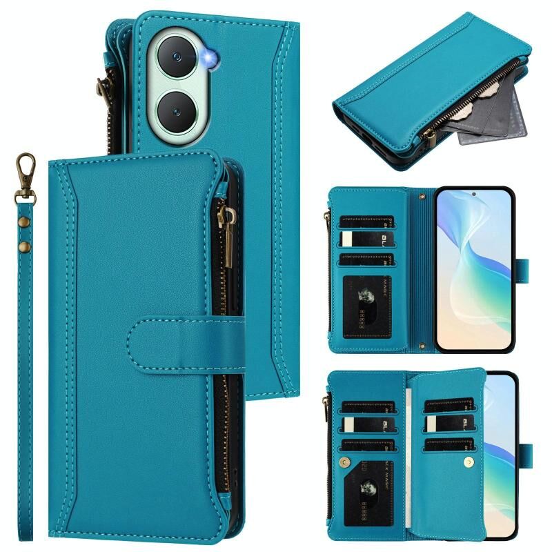 Για vivo Y03 4G Global / Y18 4G Global Μαγνητικό Κλείσιμο 9 Θήκες Καρτών Δερμάτινη Θήκη με Φερμουάρ και Λουρί Χεριού (Τουρκουάζ)