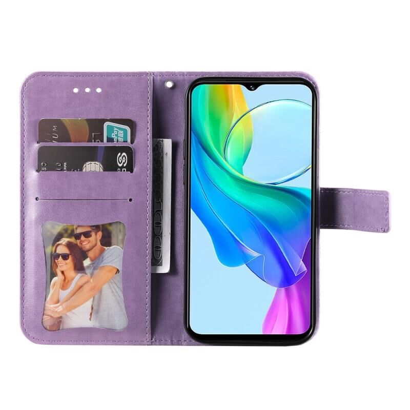 Θήκη τηλεφώνου από δέρμα με ανάγλυφα επτά πέταλα λουλουδιών για vivo Y03 4G (Ανοιχτό Μωβ)