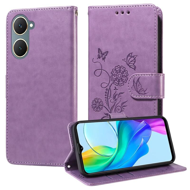 Θήκη τηλεφώνου από δέρμα με ανάγλυφα σχέδια πεταλούδας και λουλουδιών για vivo Y03 4G / Y18 / Y28s 5G (Μωβ)