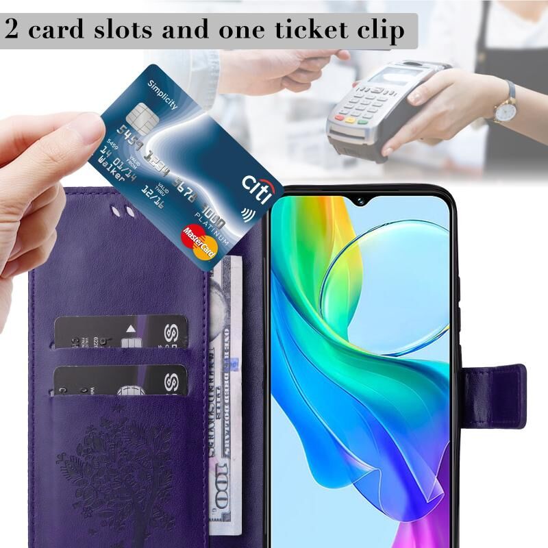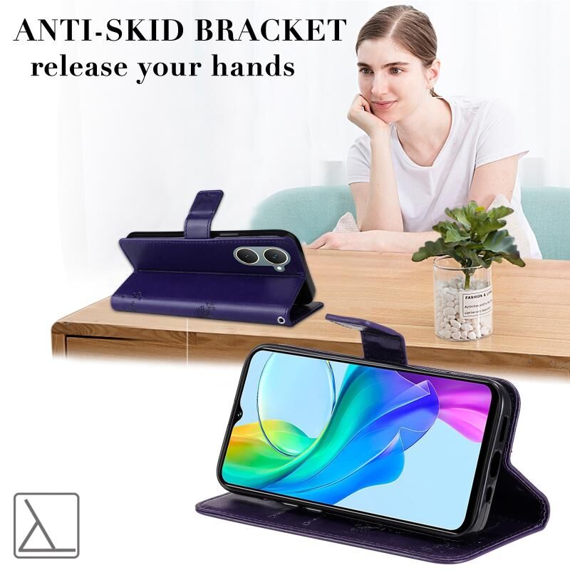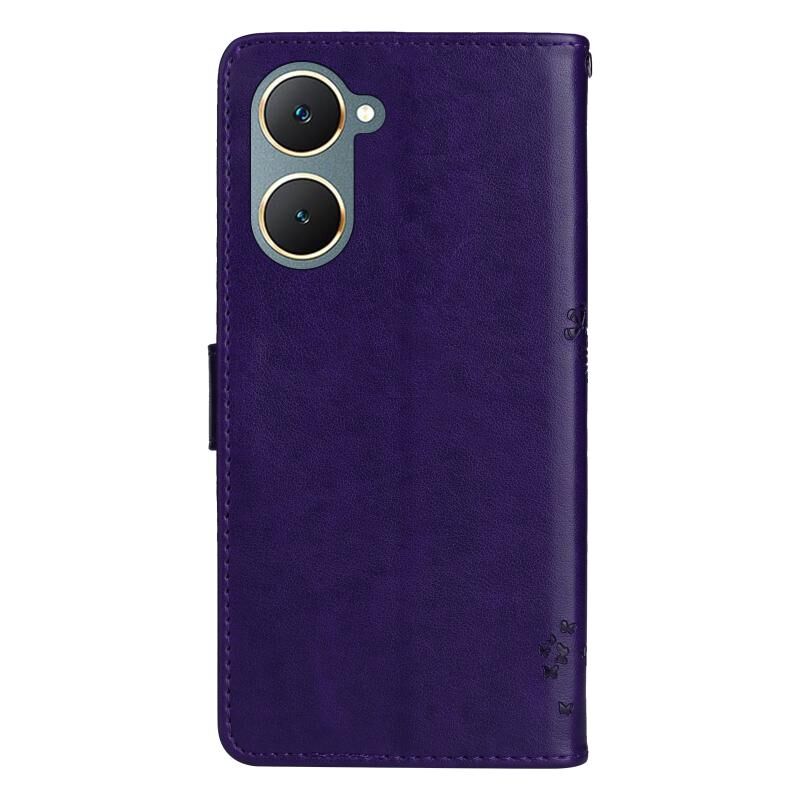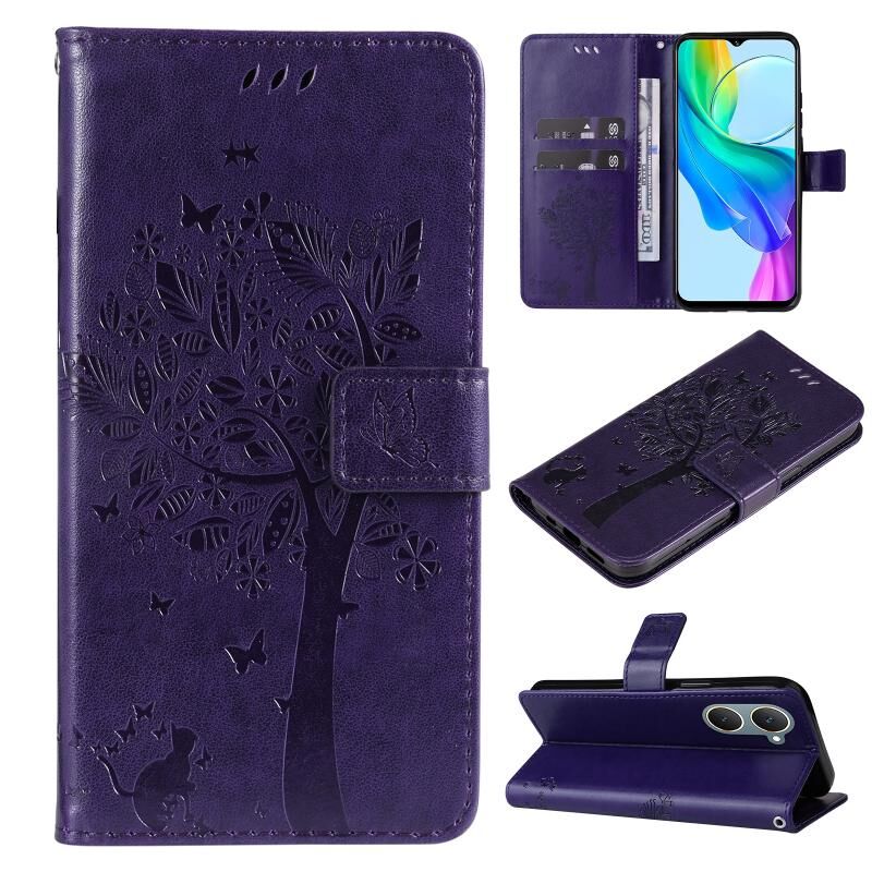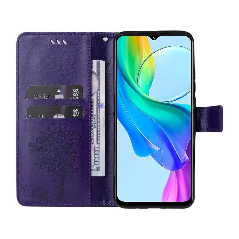 Θήκη τηλεφώνου για vivo Y03, δερμάτινη με σχέδιο ανάγλυφου δέντρου & γάτας (Ροζ)