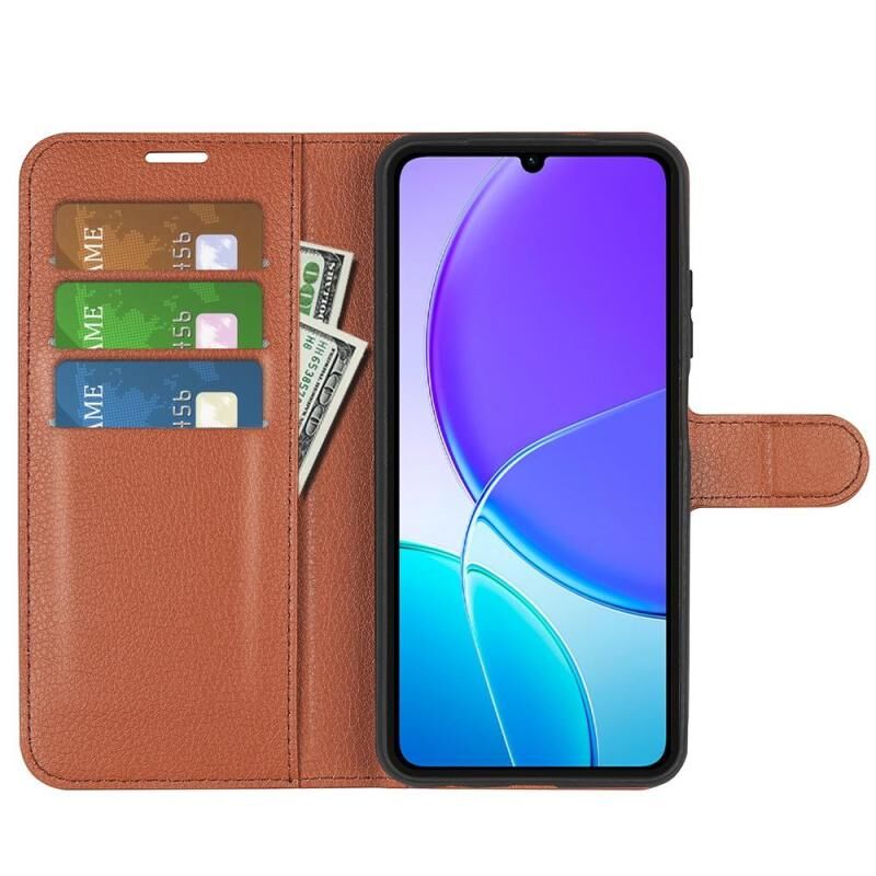 Θήκη τηλεφώνου από δέρμα με οριζόντιο άνοιγμα και υφή Λίτσι για vivo Y04 / Y29s με βάση στήριξης (Καφέ)