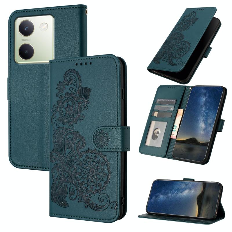 For vivo Y100 5G Global Datura Flower Embossed Flip Leather Phone Case(Dark Green)