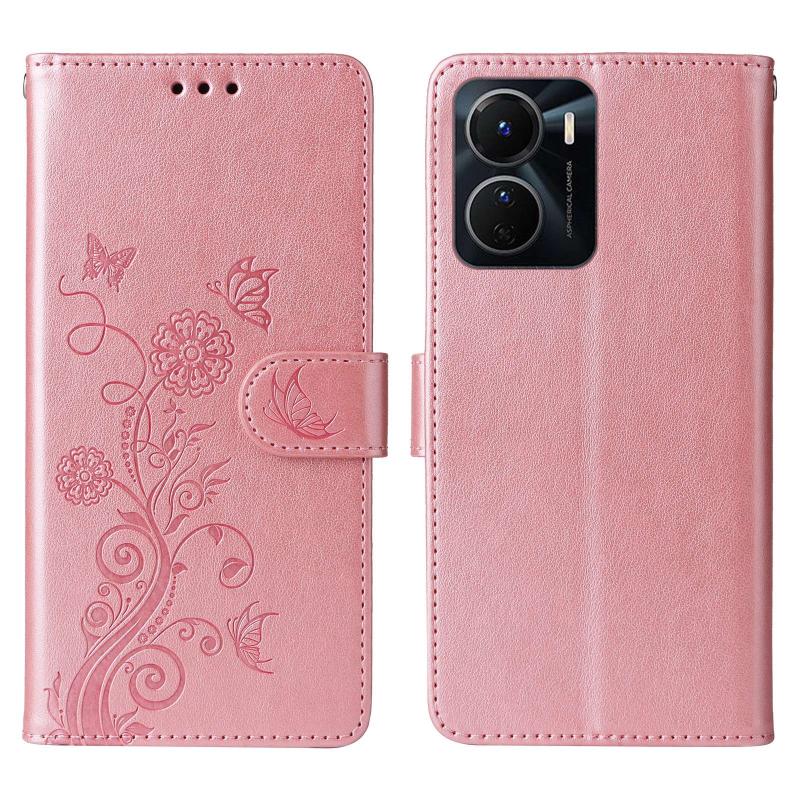 For vivo Y16 4G / Y02s / Y56 5G Global Embossed Butterfly Flowers Leather Phone Case(Rose Gold)