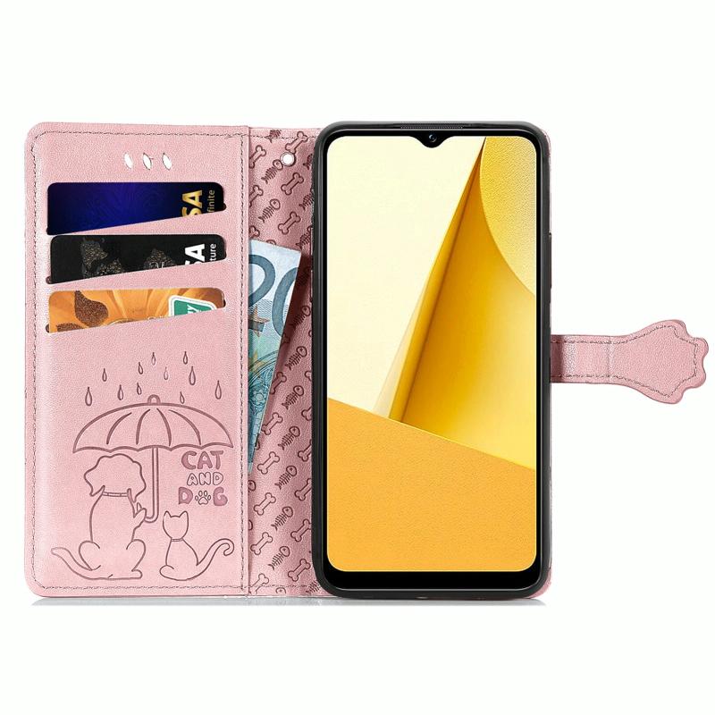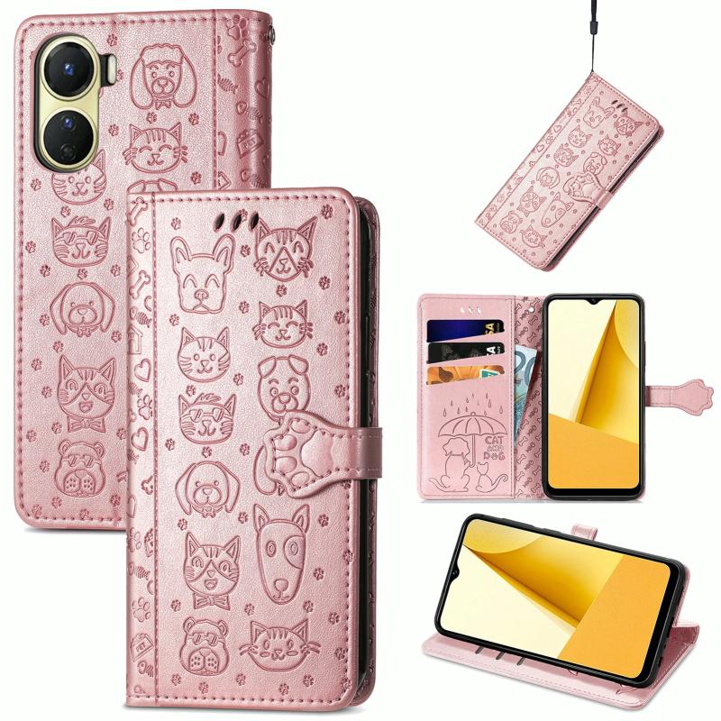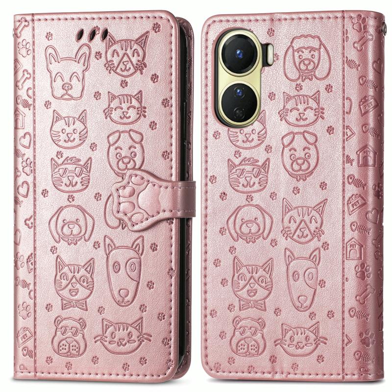 For vivo Y16 Cat and Dog Embossed Leather Phone Case(Rose Gold)