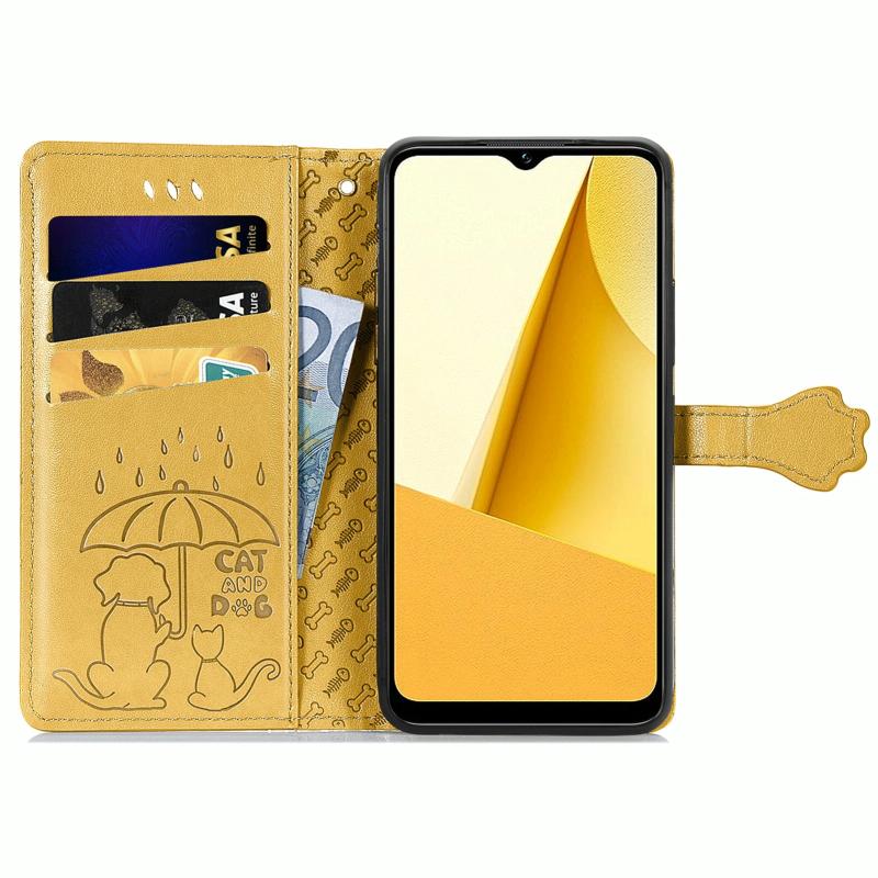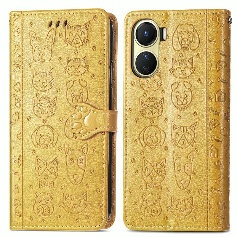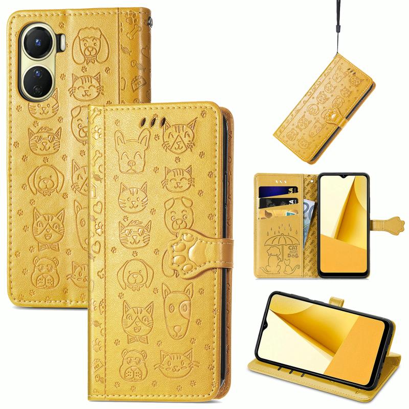 For vivo Y16 Cat and Dog Embossed Leather Phone Case(Yellow)