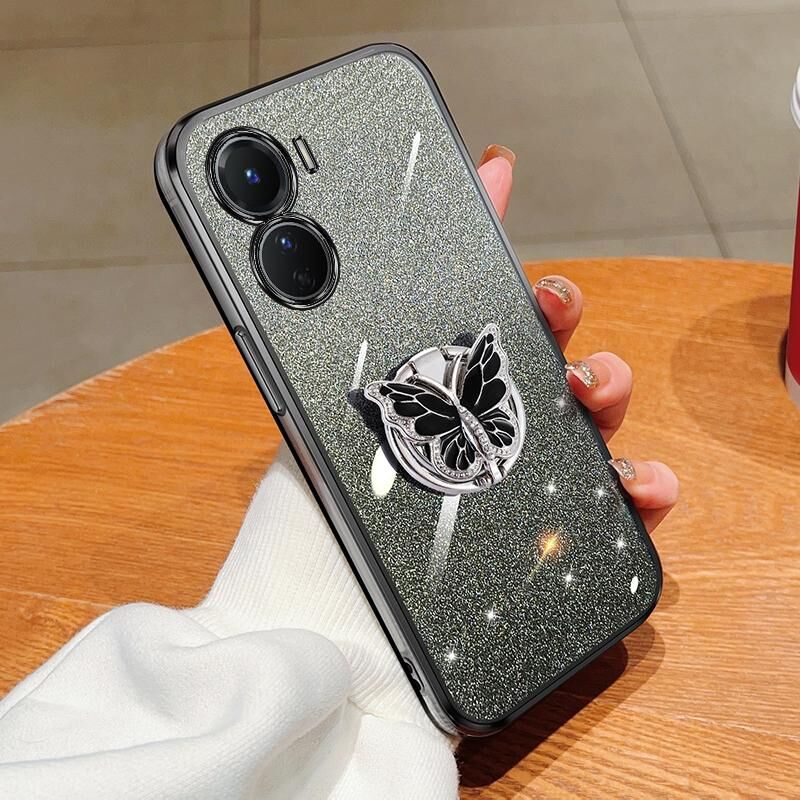 Για vivo Y16 Επιμεταλλωμένο διαβάθμιση Glitter πεταλούδα κάτοχος TPU τηλέφωνο υπόθεση (Μαύρο)