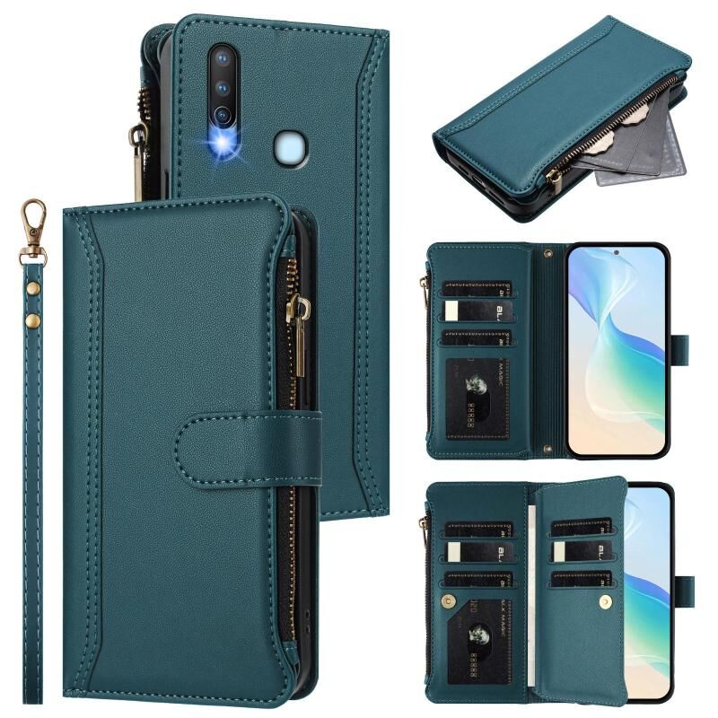Για vivo Y17 / Y15 / Y12 Παγκόσμια Μαγνητικό Κλείσιμο 9 Θήκες Καρτών Δερμάτινη Θήκη με Φερμουάρ και Λουρί Χεριού (Σκούρο Πράσινο)
