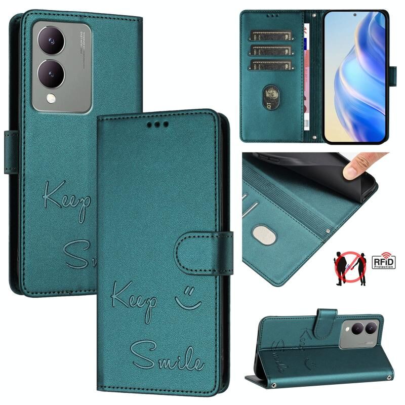 Για vivo Y17S 5G Ινδία χαμόγελο ανάγλυφο RFID δερμάτινη θήκη τηλεφώνου (Peacock Green)