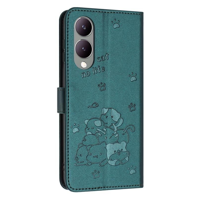 Θήκη δερμάτινη για vivo Y17s Global / Y36i 5G με ανάγλυφο γατάκι και κορδόνι (Σκούρο πράσινο)