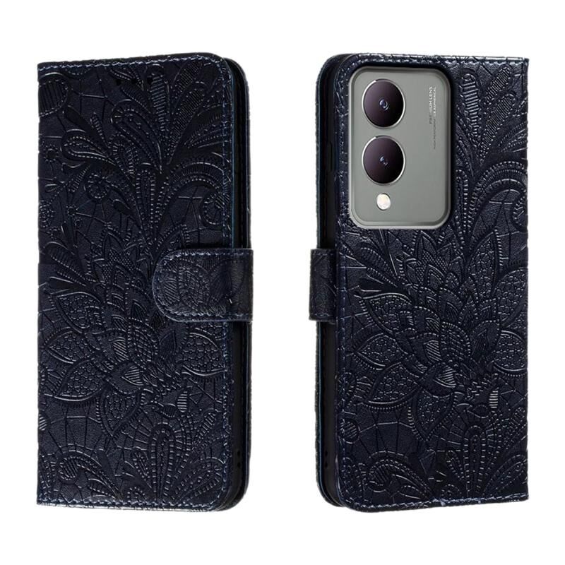 Για vivo Y17S Lace λουλούδι ανάγλυφο Flip υπόθεση τηλεφώνου δέρμα (σκούρο μπλε)
