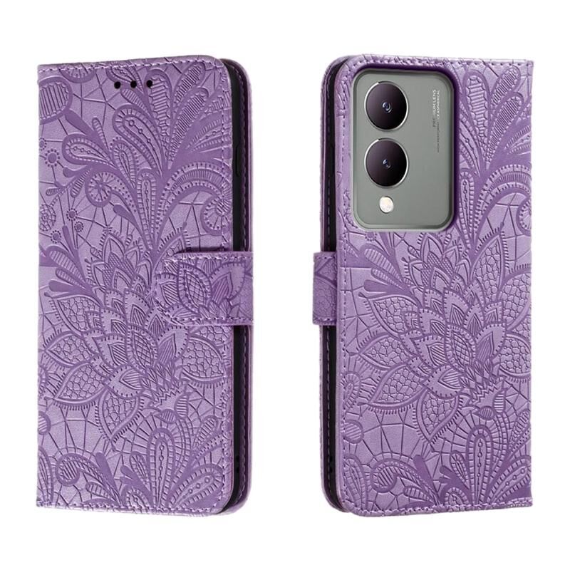 Για vivo Y17S Lace λουλούδι ανάγλυφο Flip υπόθεση τηλεφώνου δέρμα (μωβ)