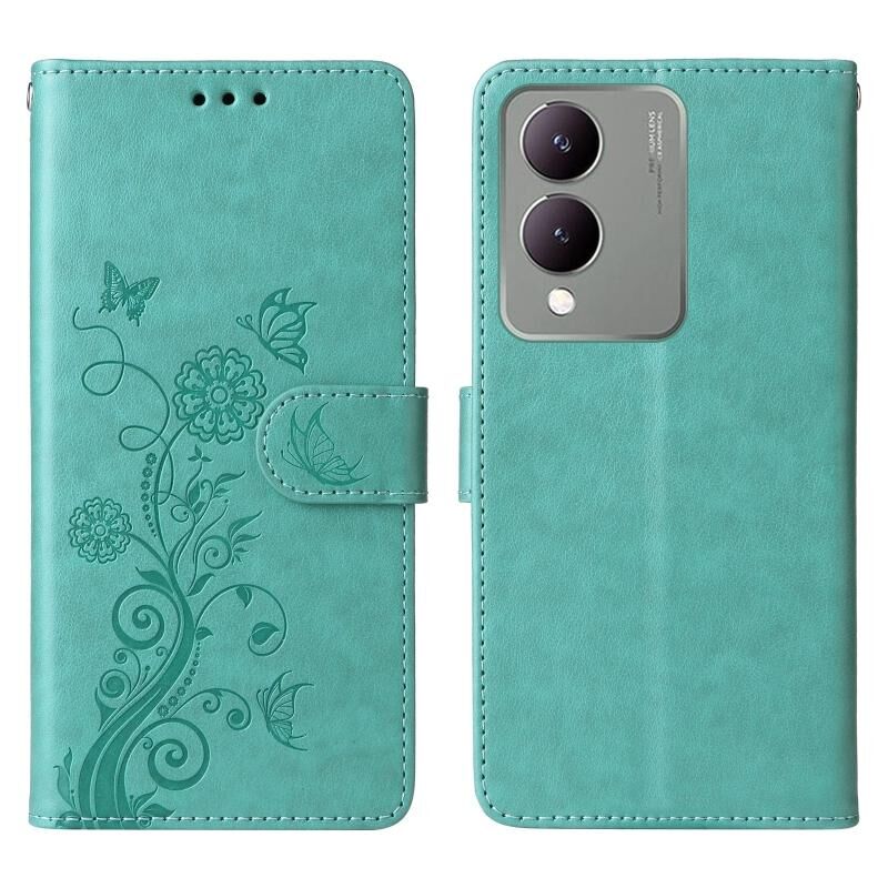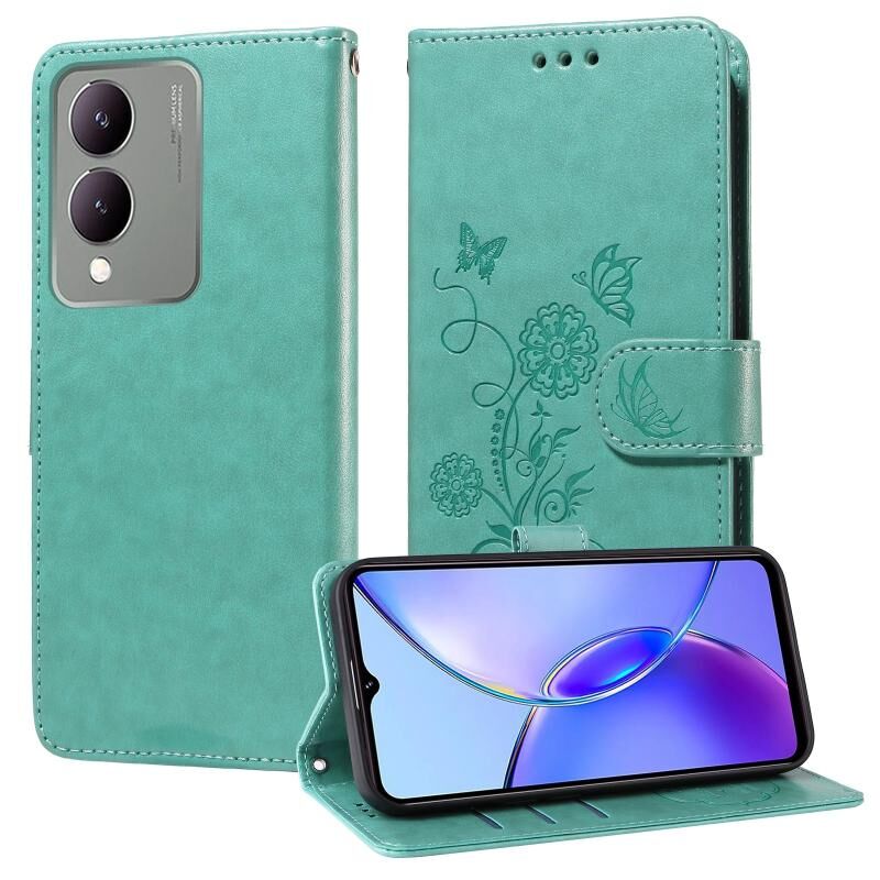 Θήκη τηλεφώνου από δέρμα με ανάγλυφα λουλούδια και πεταλούδες για vivo Y17s / Y36i 5G / Y28 5G (πράσινο)