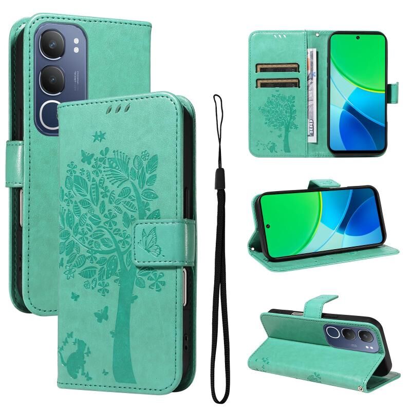 Θήκη τηλεφώνου από δέρμα με σχέδιο αναγλύφου δέντρου & γάτας για vivo Y19 4G (Ροζ)