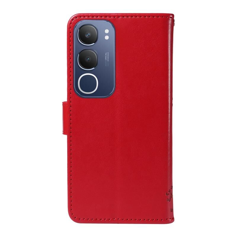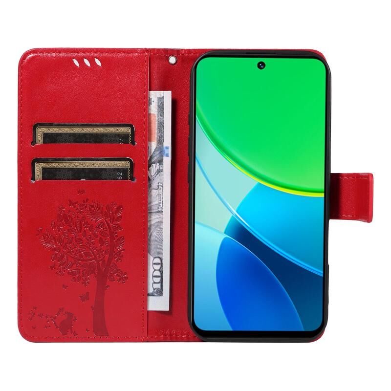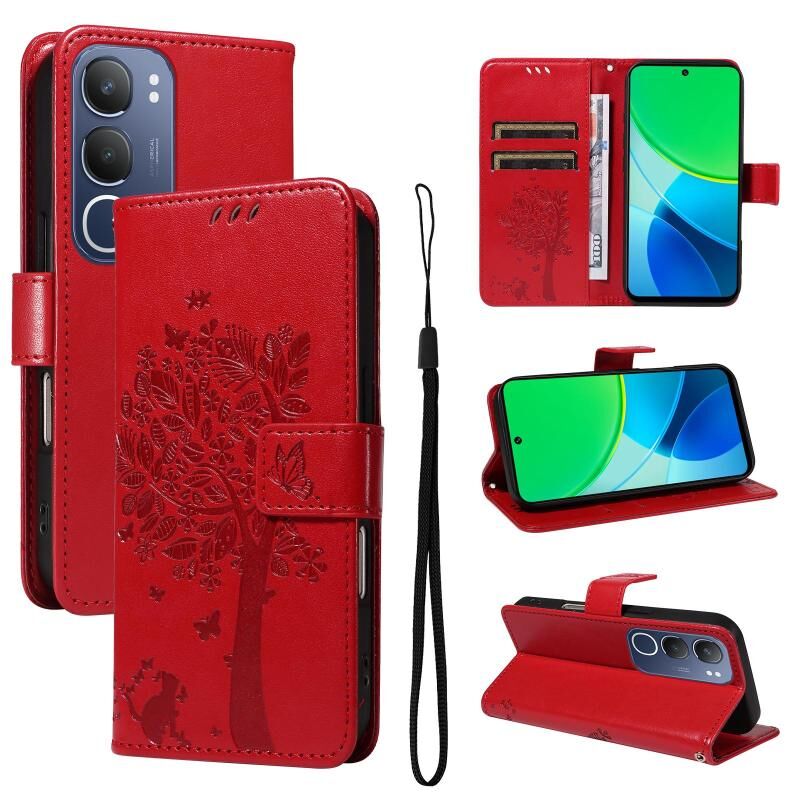 Θήκη τηλεφώνου από δέρμα με σχέδιο αναγλύφου δέντρου & γάτας για vivo Y19 4G (Κόκκινο)