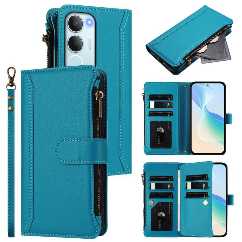 Για vivo Y19S 4G Global Μαγνητικό Κλείσιμο 9 Θήκες Καρτών Δερμάτινη Θήκη με Φερμουάρ και Λουρί Χεριού (Τουρκουάζ)