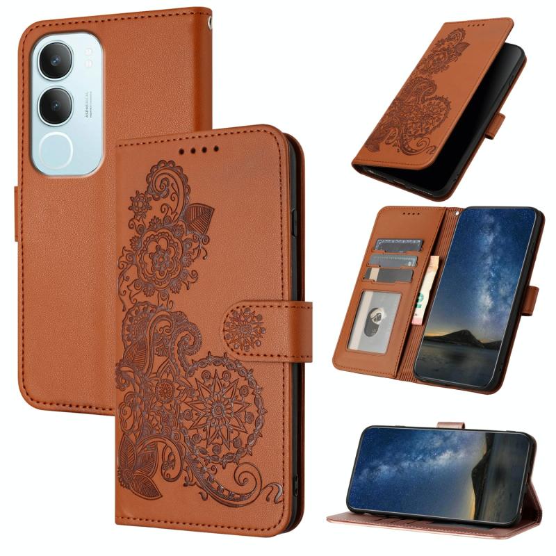 For vivo Y19s Global Datura Flower Embossed Flip Leather Phone Case(Brown)