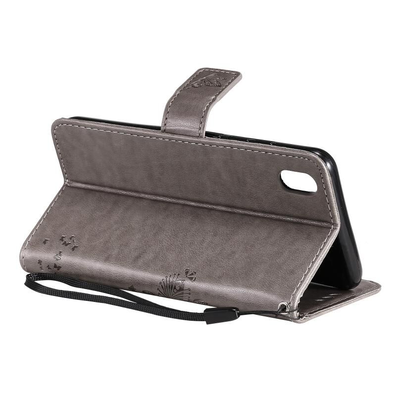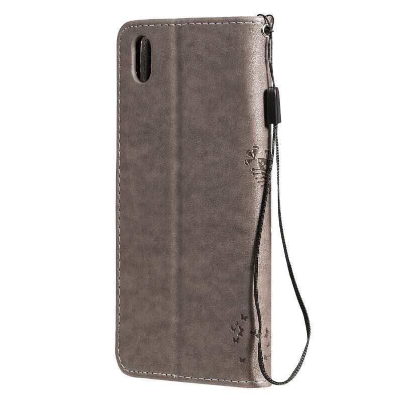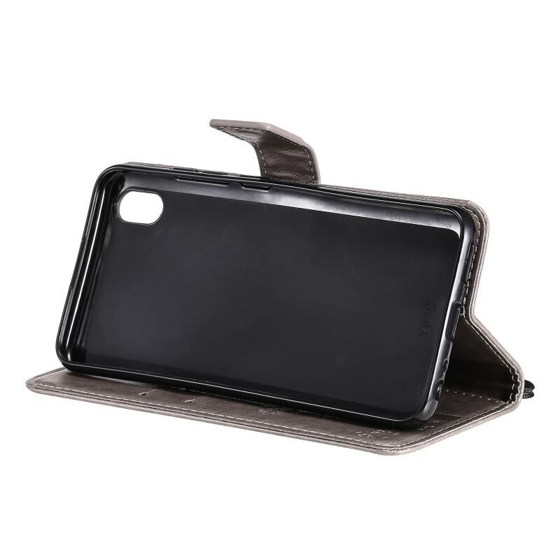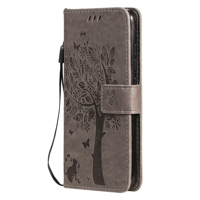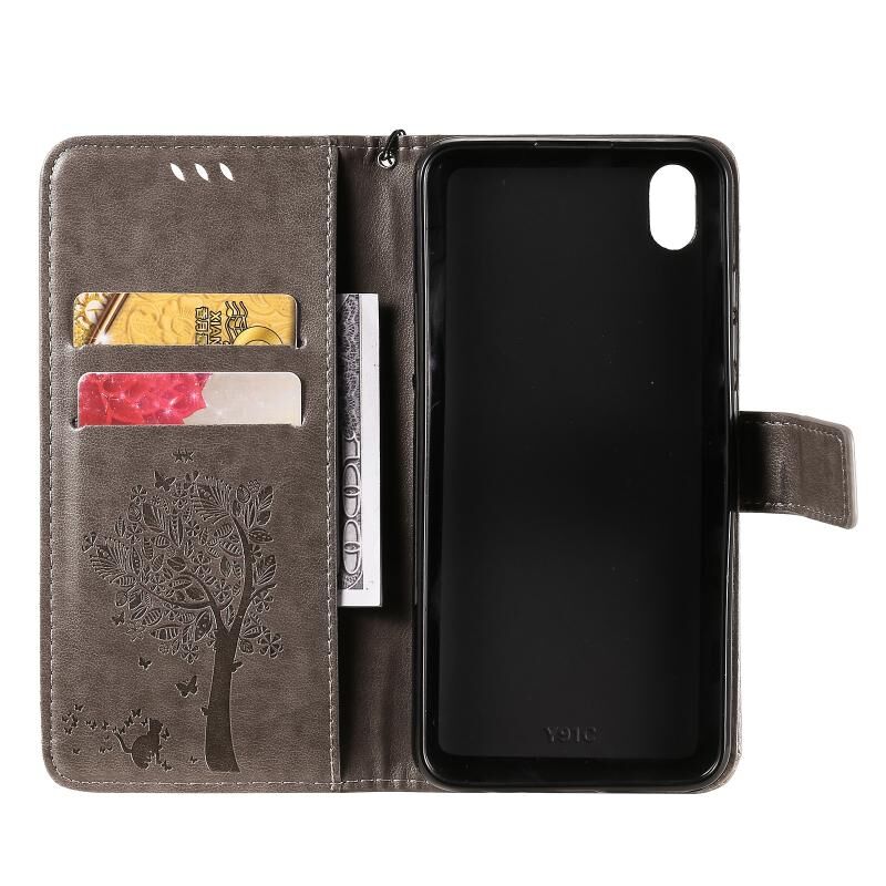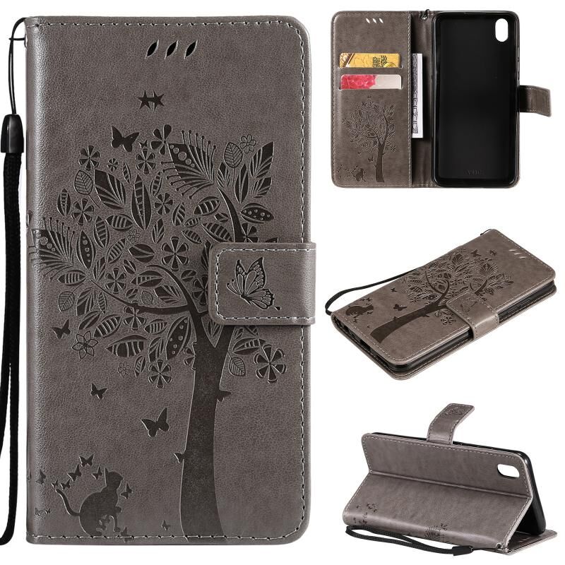 Θήκη για vivo Y1s / Y90 / Y91C με ανάγλυφο σχέδιο Δέντρου & Γάτας, οριζόντια, από δερματίνη PU με βάση στήριξης & θήκες για κάρτες & πορτοφόλι & κορδόνι (Γκρι)