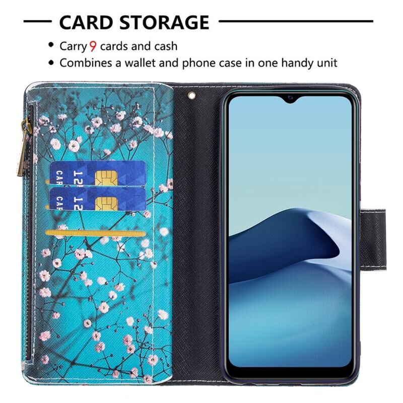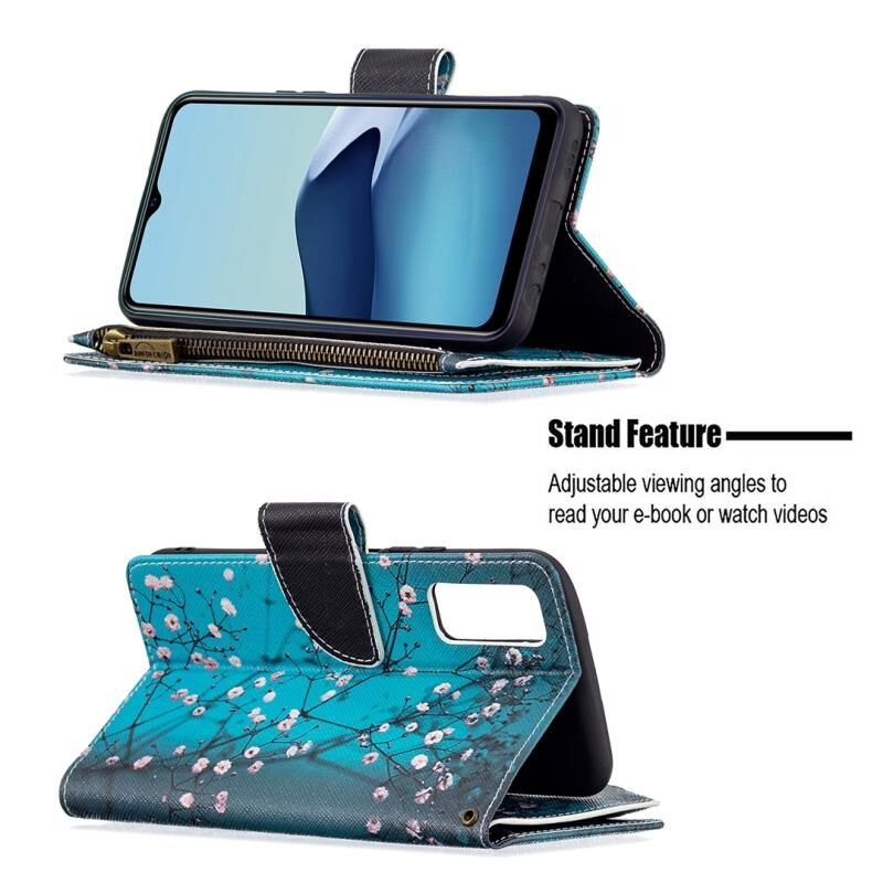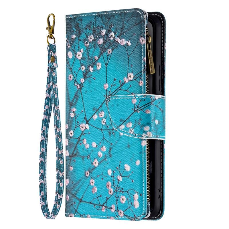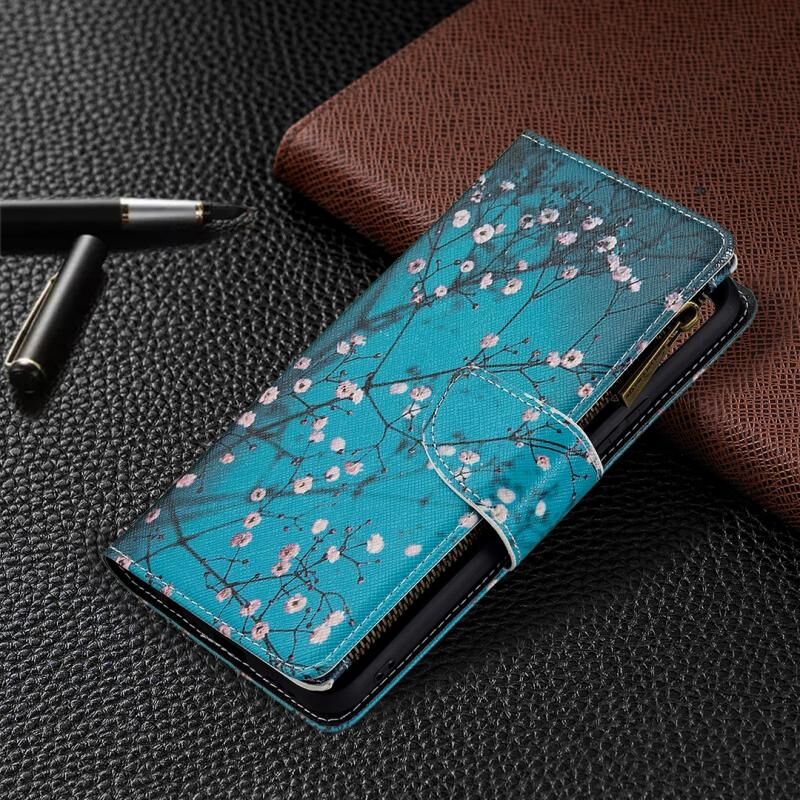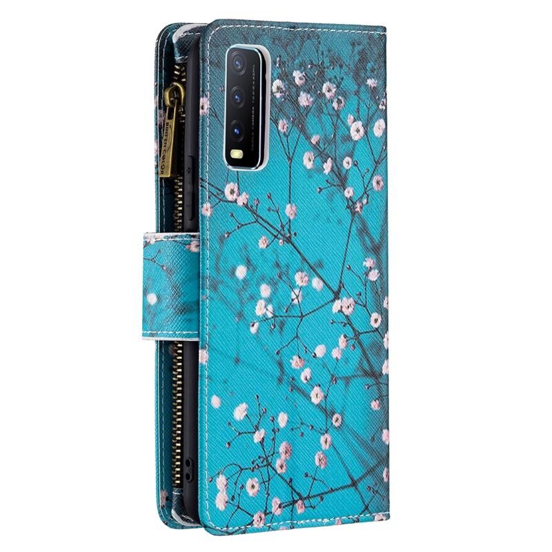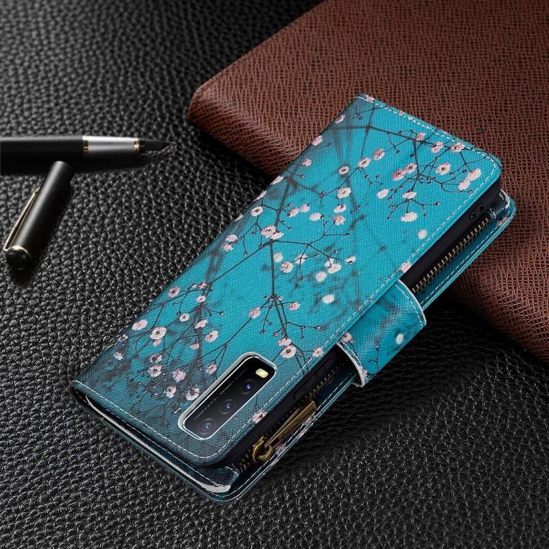 Θήκη δέρματος οριζόντιας αναδίπλωσης με φερμουάρ και σχέδιο ζωγραφικής για vivo Y20 (Λουλούδι Δαμασκηνιάς) με βάση για κάρτες και πορτοφόλι.