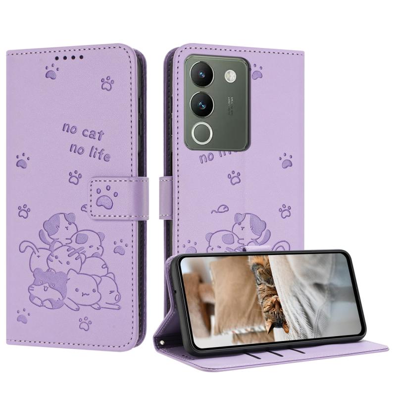 For vivo Y200 5G Global Embossed Kitten Phone Leather Case with Lanyard(Purple)