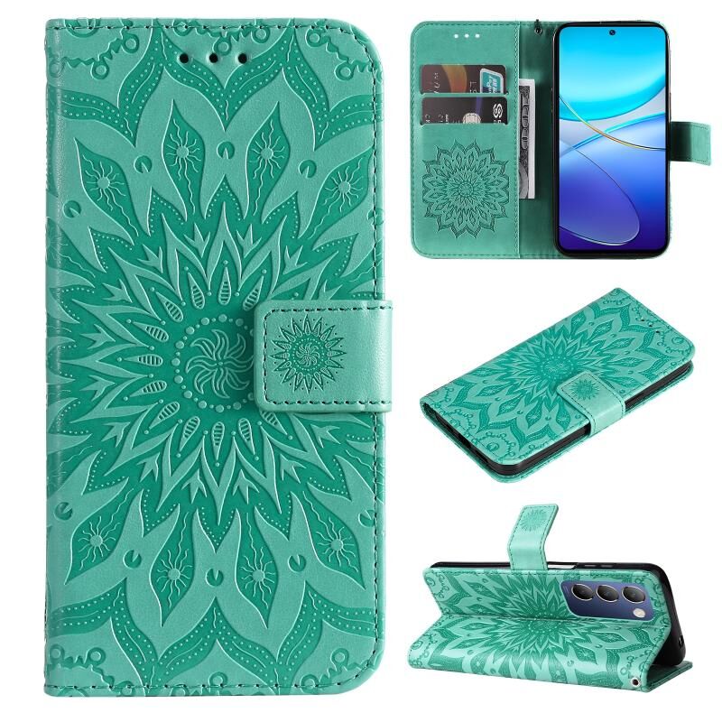 Για το vivo Y200e 5G Global / V30 Lite Ινδία ανάγλυφο ηλιοτρόπιο μοτίβο Flip δέρμα τηλέφωνο υπόθεση (πράσινο)