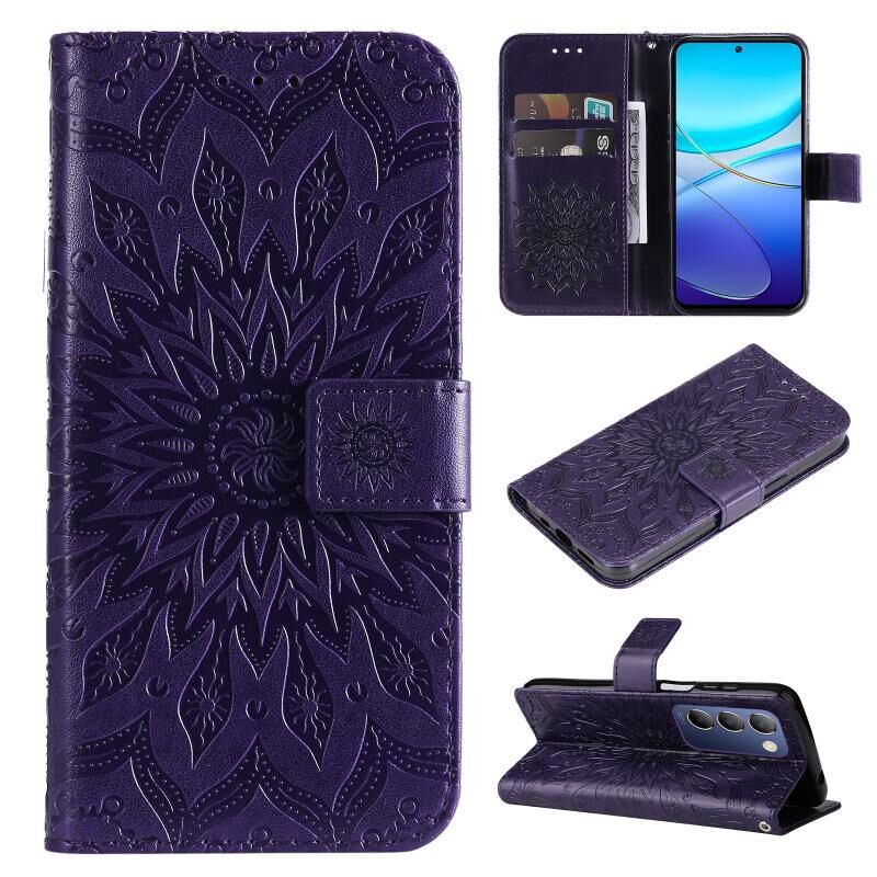 Για το vivo Y200e 5G Global / V30 Lite Ινδία ανάγλυφο ηλιοτρόπιο μοτίβο Flip δέρμα τηλέφωνο υπόθεση (μωβ)