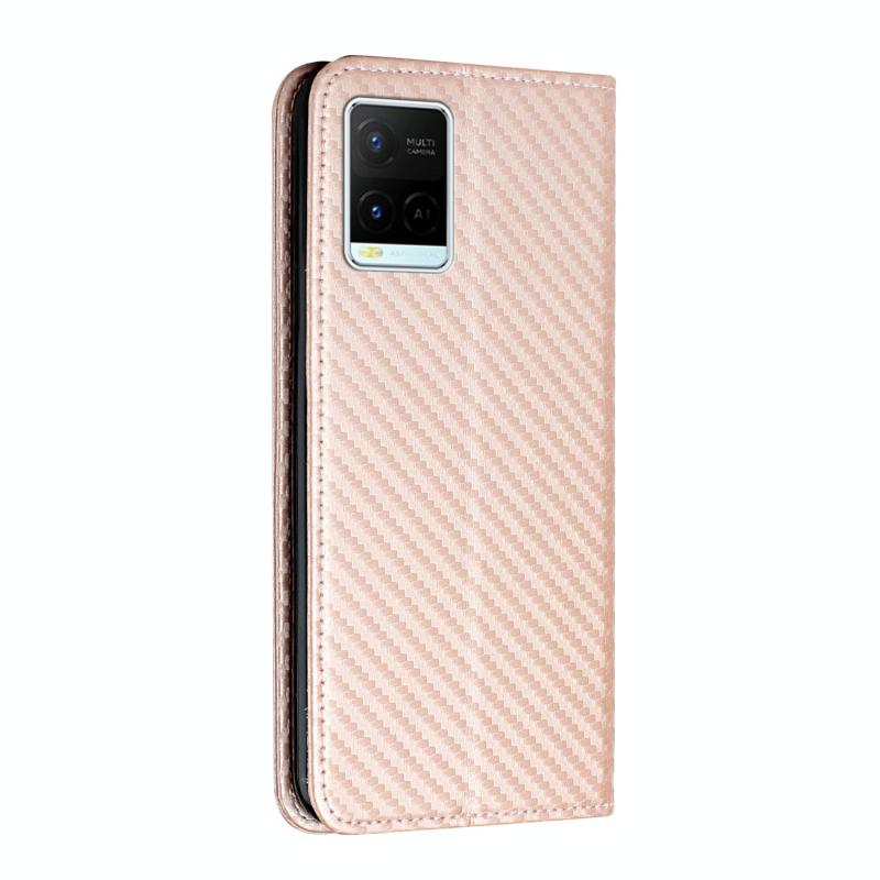 Για vivo Y21 Θήκη Δερμάτινη με Υφή Άνθρακα & Λειτουργία Στήριξης (Ροζ Χρυσό)